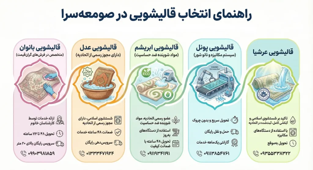 در صومعهسرا قالیشوییهای متعددی فعالیت میکنند، اما بهدلیل ارزش بالای فرشها، بهویژه فرشهای دستباف، انتخاب مرکز معتبر اهمیت زیادی دارد. پیش از سپردن فرش، باید از داشتن مجوز رسمی، تجهیزات مناسب مانند گرمخانه گازی و ارائه ضمانتنامه شستشو مطمئن شوید. انتخاب یک قالیشویی حرفهای باعث حفظ سلامت، زیبایی و افزایش عمر فرش میشود.